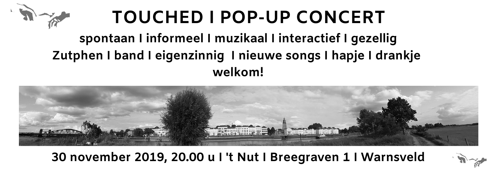 Touched maakt doorlopend nieuwe songs. Deze delen we graag met je, zelfs als ze niet helemaal af zijn. Nieuwsgierig? Kom naar ons pop-up concert op 30 november in buurthuis ’t Nut gebouw, Breegraven 1 in Warnsveld. We beginnen om een uur of 8 (20.00 uur).