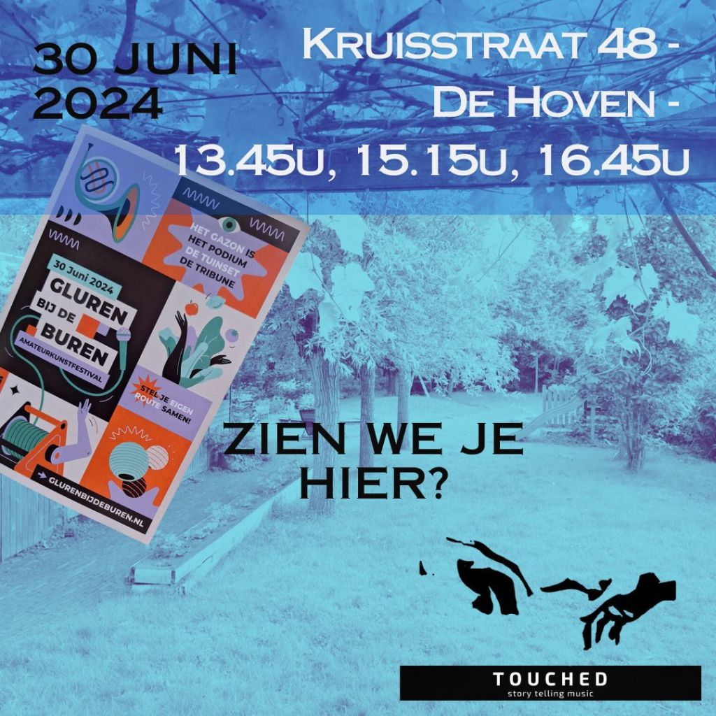 TOUCHED doet dit jaar weer mee met Gluren bij de Buren. In de tuin die je hieronder op het plaatje ziet, spelen we onze eigen liedjes en soms een liedje van een ander. Nieuwsgierig? Kom naar Kruisstraat 48 in De Hoven. We spelen om 13.45u, 15.15u en 16.45u.